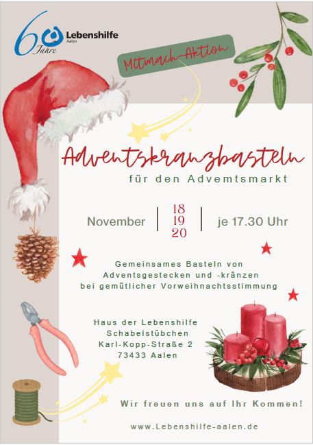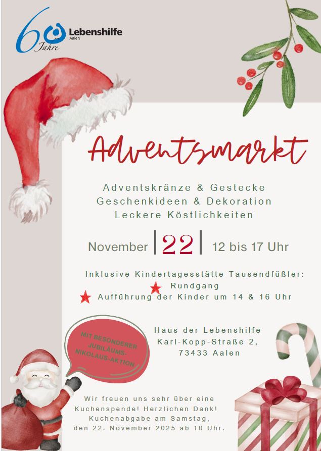 Am Samstag, den 22. November 2025 findet der diesjährige Adventsmarkt der Lebenshilfe Aalen statt. Kommen Soie zu uns ins Haus der Lebenshilf...