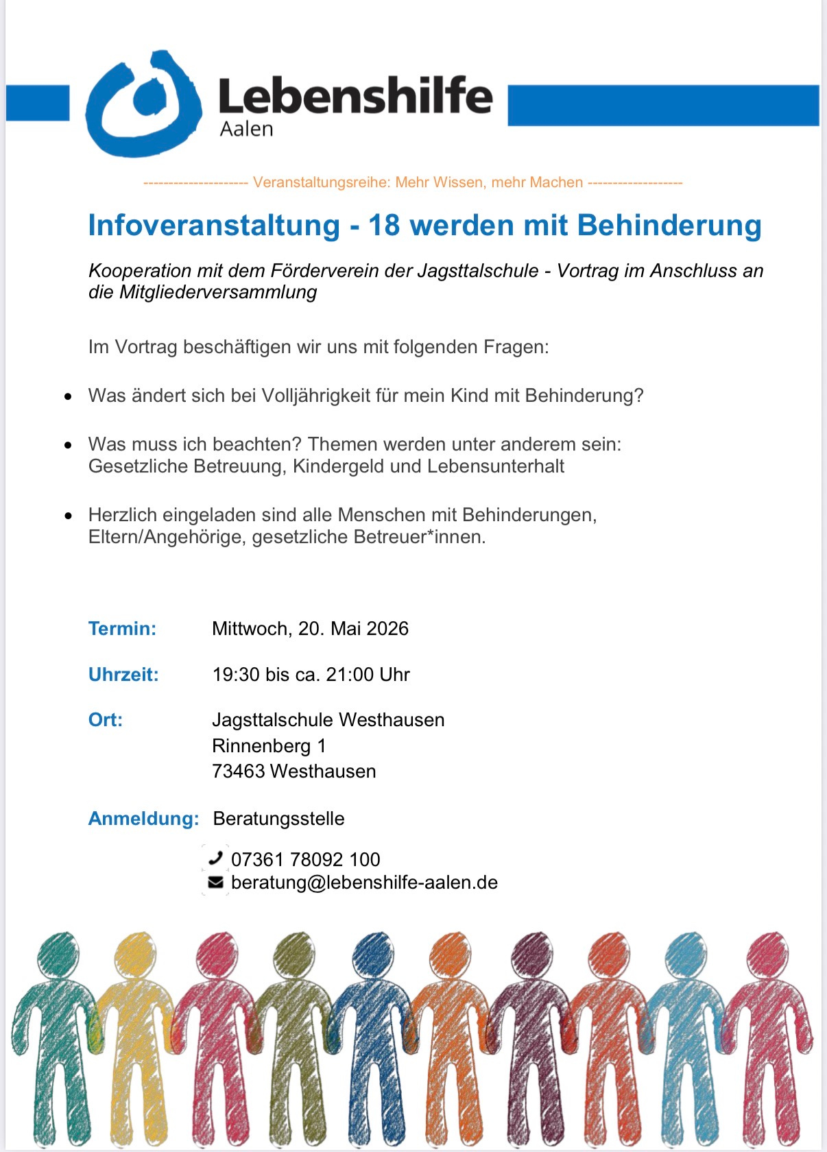 Die Veranstaltung findet in Kooperation mit dem Förderverein der Jagsttalschule statt und richtet sich an Menschen mit Behinderung, Eltern, Angehörige sowie gesetzliche Betreuer*innen.