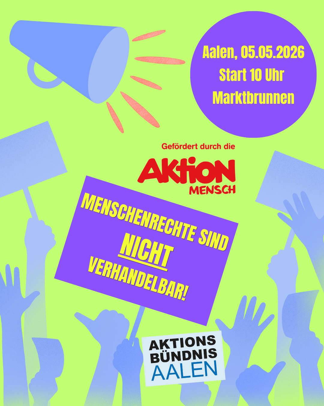 Am Europäischen Gleichstellungstag, dem 5. Mai 2026, lädt das Aktionsbündnis Aalen zu einer Protestaktion in die Aalener Innenstadt ein. Unter dem Motto „Menschenrechte sind nicht verhandelbar“ verbindet die Veranstaltung einen Protestmarsch mit persönlichen Erfahrungsberichten und öffentlicher Aufklärung.