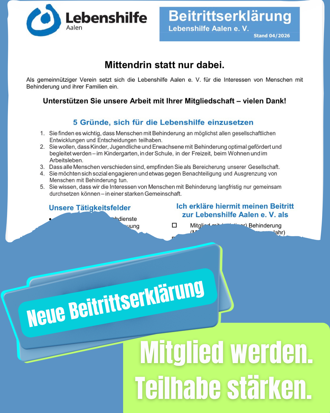 Mit unserer Petition machen wir aktuell deutlich, wie wichtig verlässliche Unterstützung für Menschen mit Behinderung ist. Doch nachhaltige Veränderung braucht mehr als eine Unterschrift: Sie braucht eine starke Gemeinschaft.